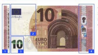 Kantel het biljet en kijk naar het zilverkleurige streephologram. In het hologram op het nieuwe biljet zijn een portret van de Griekse prinses Europa en het euroteken, een raamkozijn en de waarde van het biljet te zien. Ook moet er een regenboogeffect te zien zijn van verschillende kleuren die vloeiend in elkaar overlopen.