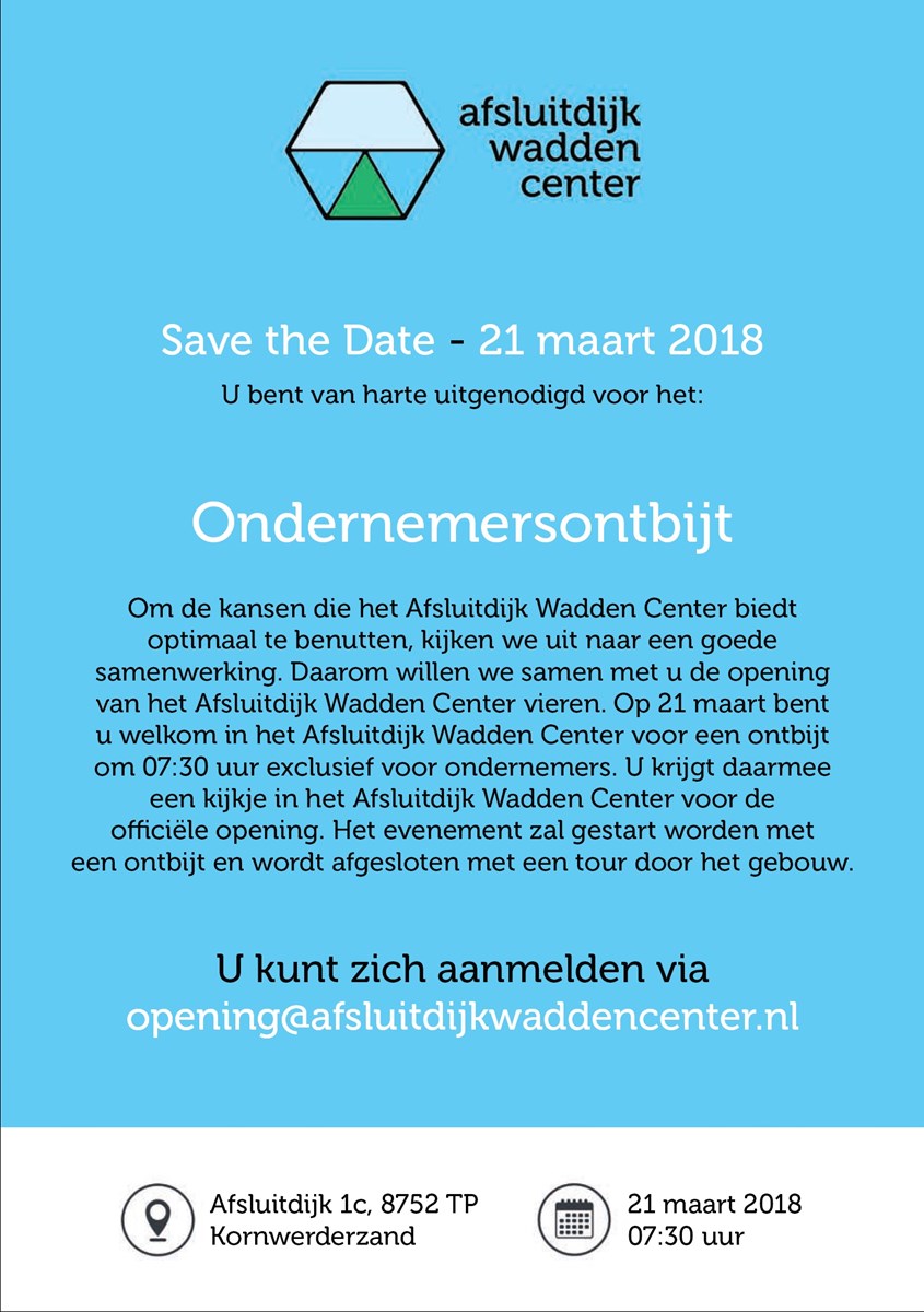 Om de kansen die het Afsluitdijk Wadden Center biedt optimaal te benutten, kijken we uit naar een goede samenwerking. Daarom willen we samen met u de opening van het Afsluitdijk Wadden Center vieren. Op 21 maart bent u welkom in het Afsluitdijk Wadden Center voor een ontbijt om 07:30 uur exclusief voor ondernemers. U krijgt daarmee