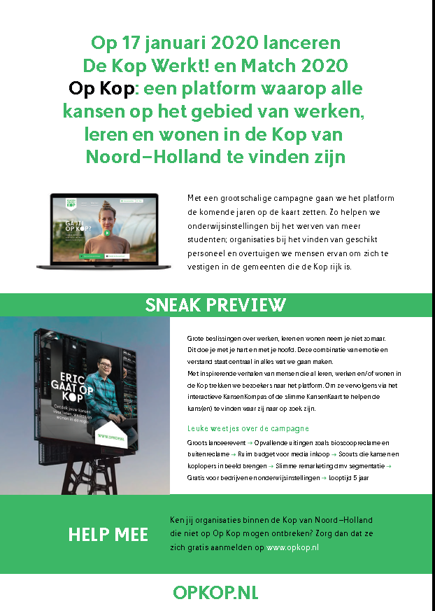 Hét online platform voor werken, leren en wonen in de Kop van Noord-Holland wordt op vrijdagmiddag 17 januari 2020 om 14.30 uur op feestelijke wijze gelanceerd. OpKop.nl maakt voor bezoekers alle kansen in de Kop inzichtelijk en laat dat op een aantrekkelijke manier zien. Dat gebeurt ook aan de hand van de grootschalige promotiecampagne die twee jaar gaat lopen. De lancering van OpKop.nl is in Theater de Kampanje in Den Helder.