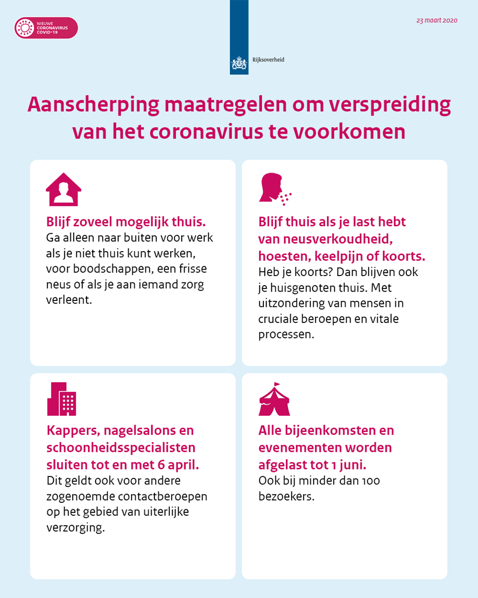 Maandag 23 maart heeft het kabinet aanvullende maatregelen genomen in de aanpak van het coronavirus. Minister-president Rutte en de ministers De Jonge, Grapperhaus en Van Rijn lichtten de maatregelen (gebaseerd op advies van het RIVM) maandag 23 maart 2020 toe tijdens een persbijeenkomst.