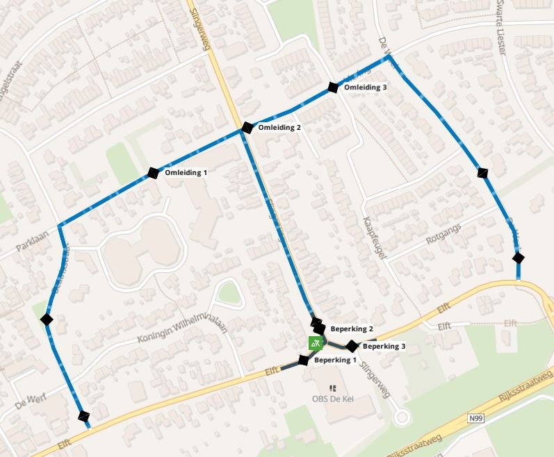 De werkzaamheden bestaan uit de herinrichting van de hoofdrijbaan wegens de plaatsing van de nieuwe brede school aan de Elft.