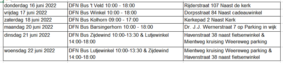 We zijn nog lang niet aan het einde van de glasvezelcampagne, maar wij zijn al wel activiteiten aan het organiseren voor de laatste weken. We hebben een tijdelijke winkel (het Glasvezel Informatiepunt) in het winkelcentrum van Nieuwe Niedorp. Richting het einde van de campagne willen we ook graag aanwezig zijn in de overige kernen van Hollands Kroon waar de glasvezelcampagne loopt. Daarvoor zetten we een bus in. Deze bus dient als een pop-up winkeltje en daar kunnen bewoners langslopen met vragen en voor hulp bij het afsluiten van een abonnement. Deze bus staat op de volgende data op de volgende locaties zie bovenstaande afbeelding.